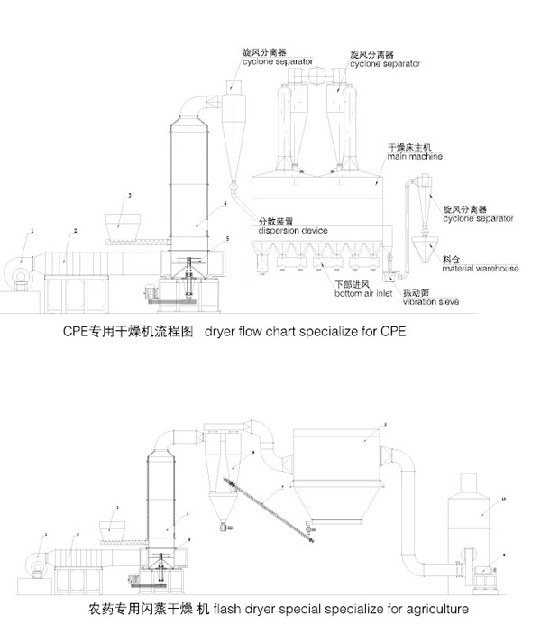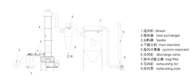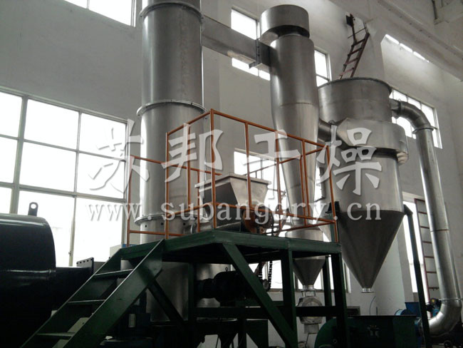 熱空氣由入口管以適宜的噴動速度從干燥機底部進入攪拌粉碎干燥室,對物料產生強烈的剪切、吹浮、旋轉作用,于是物料受到離心、剪切、碰撞、摩擦而被微粒化,強化了傳質傳熱。在干燥機底部,較大較濕的顆粒團在攪拌器的作用下被機械破碎,濕含量較低、顆粒度較小的顆粒被旋轉氣流夾帶上升,在上升過程中進一步干燥。由于氣固兩相作旋轉流動,固相慣性大于氣相,固氣兩相間的相對速度較大,強化兩相間的傳質傳熱,所以該機生產強度高。