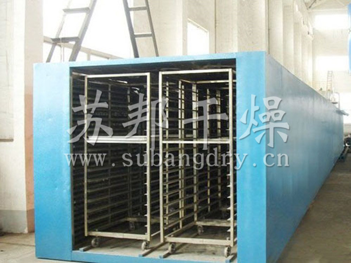 隧道烘箱料盤放置于小車上,循環(huán)風(fēng)經(jīng)過熱源換熱后吹過物料表面,進(jìn)行干燥。如需要物料翻身可以將車從烘箱內(nèi)拉出。